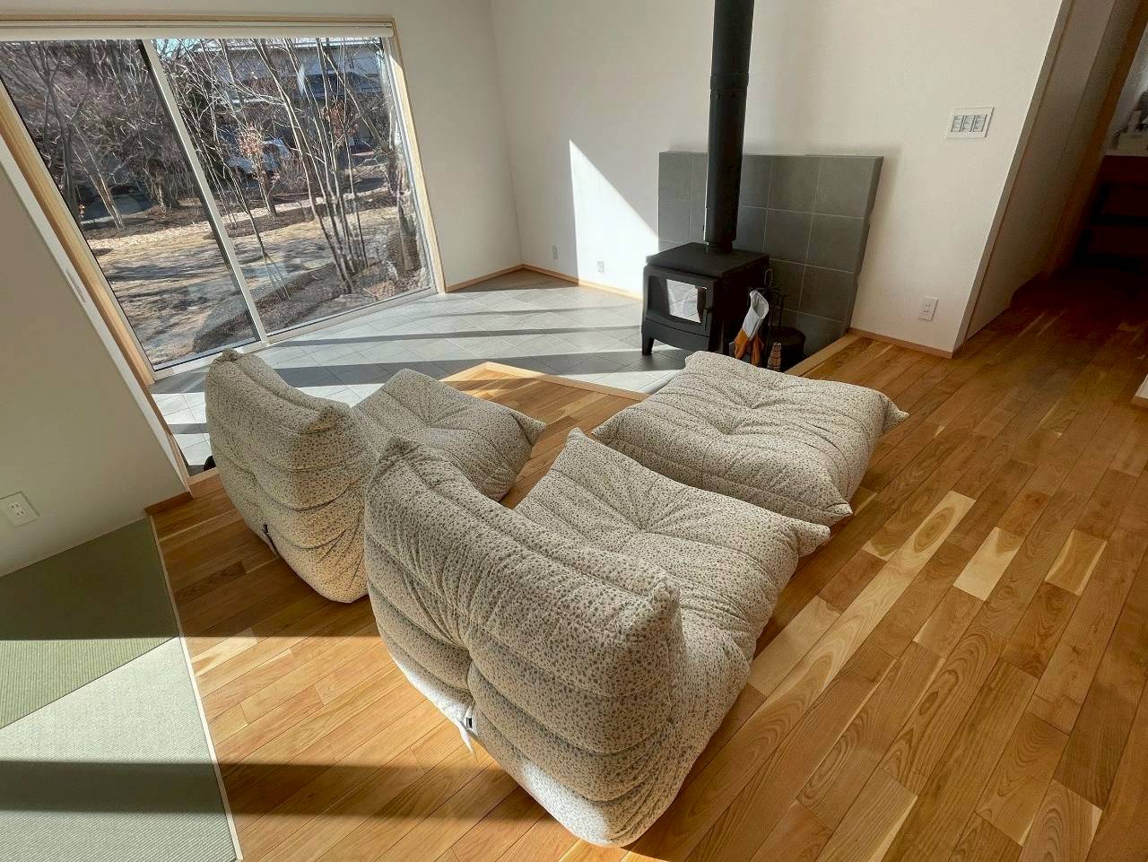 パフは多きめなので脚を乗せるだけでなく、来客時は1人掛けとしてもお使いいただけます。