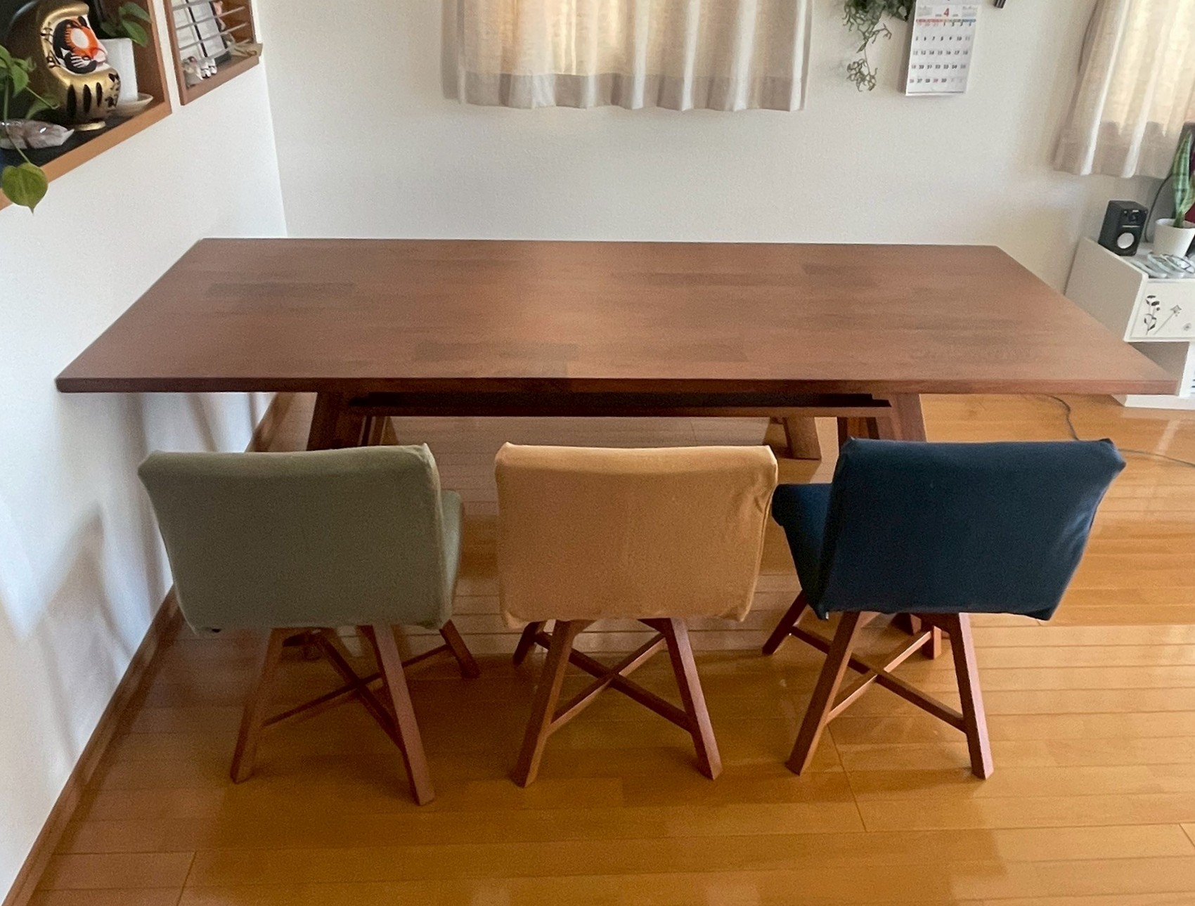補強も兼ねた天板下の棚板は、テーブルの上のものがお食事の際などにサッと片付けられ便利です。